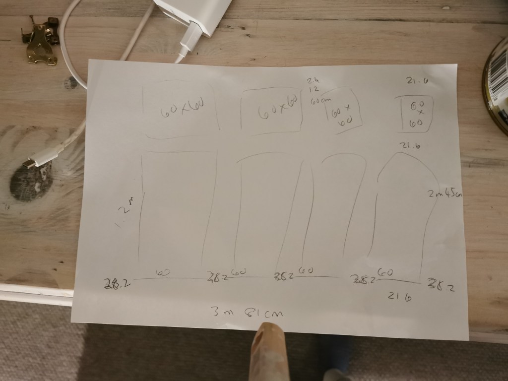 My next step was to move the bedroom furniture out of the way to measure my master bedroom wall which was 2.45m high and 3.81m long. So the sum was to take 4 x 60 (the width of each of the 4 boxes) away from the overall width of the room (3.81m-60cm×4=1.41m), then divide the remainder by 5 to work out the spacing between each box (1.41m÷5=28.2cm). So basically going width ways, each box would need to be 28.2 cm apart to fit 4 boxes equally spaced across the wall.